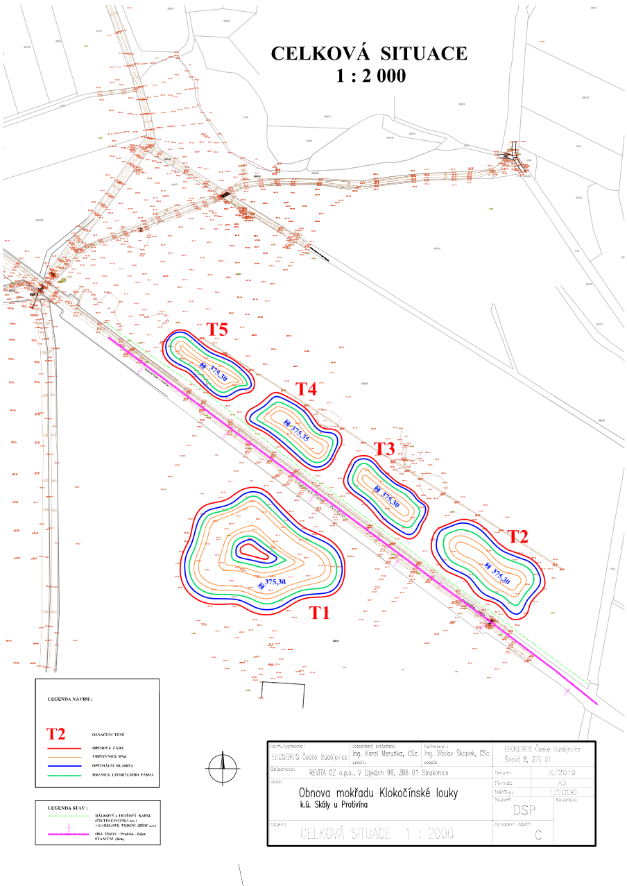 Tůň T1 bude vyhloubena na holině obklopené lužním porostem. Zemní práce spočívají v odtěžení, odvodnění a odtransportování zeminy na konečné úložiště. Odtěžování bude prováděno podle jednotlivých příčných profilů a dno tůně bude po dokončené těžbě urovnáno do požadovaného sklonu. Tůně T2 – T5 budou plnit doplňkovou funkci k managementu bezkolencových luk. Na levý okraj tůní navazují křoviny složené převážně z náletových olšin s vrbou křehkou, vrbou popelavou a vrbou jívou, které bude nutné částečně odstranit. Odtěžování zeminy bude prováděno podle jednotlivých příčných profilů a dno tůní bude po dokončené těžbě urovnáno do požadovaného sklonu. V případě značného zamokření půdního profilu se předpokládá, že bahno nevhodné k okamžitému transportu bude dočasně deponováno na místě vzniku. Vlastní finální transport bahna proběhne až po jeho odvodnění.